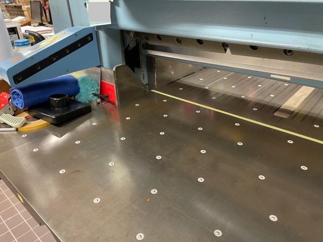 Hydraulic paper cutter with digital control panel with 999 programs (each with 99 steps and ejection function) and digital readout with monitor, hydraulic pressing and cutting. Work bed with air supply and extra large side table (also with air supply). All relevant safety devices (IR bars, monitors, 2-hand control, sensors). 1 spare knife, manuals and tools.